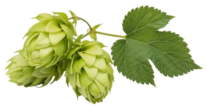 Close-up of green hop cones on a branch with leaves, isolated on a transparent background