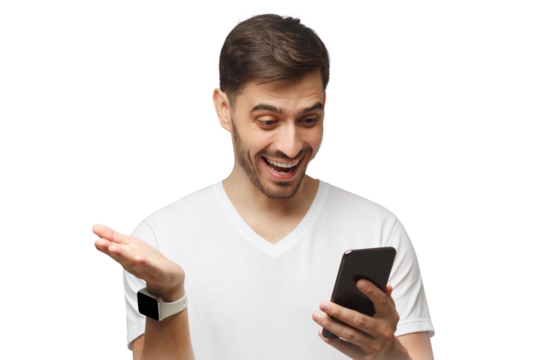 Young positive man wearing white t-shirt, holding cellphone in hand and looking at application on screen with excited smile