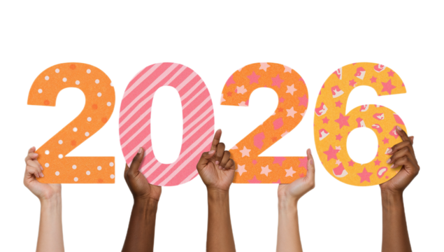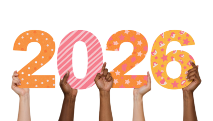 Happy New Year 2026 concept with diverse hands holding colorful number decorations
