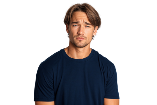 Unemployed young man feeling stressed and hopeless after losing his job, isolated on transparent background