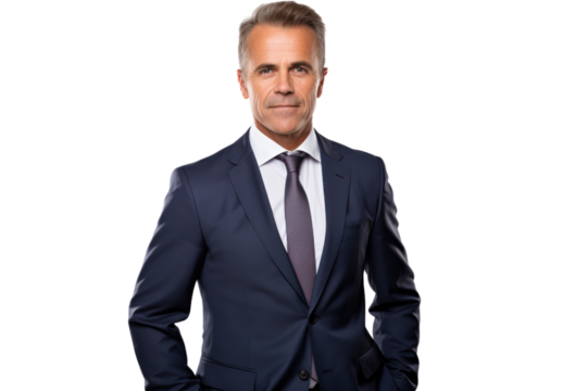 Middle-aged man with a confident smile, wearing a business suit and tie, standing with arms crossed. Isolated on white background