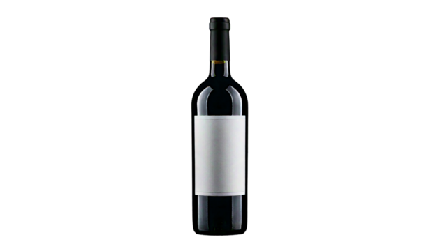 Dark glass wine bottle, with blank white label and black cap, isolated on a transparent back.png