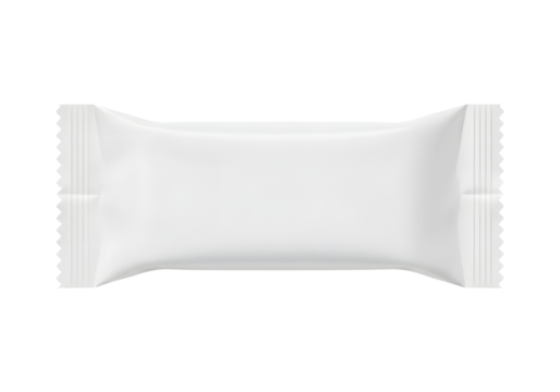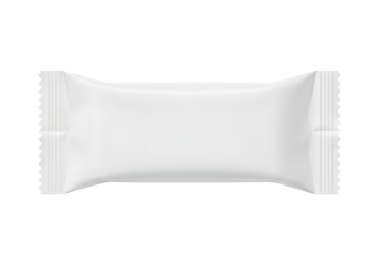 Blank white flow pack wrapper mockup for a chocolate snack bar isolated on a white or transparent background
