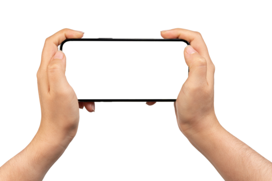 Horizontal smartphone held with both hands transparent, blank screen mockup great for video, game UI previews, or landscape app presentations