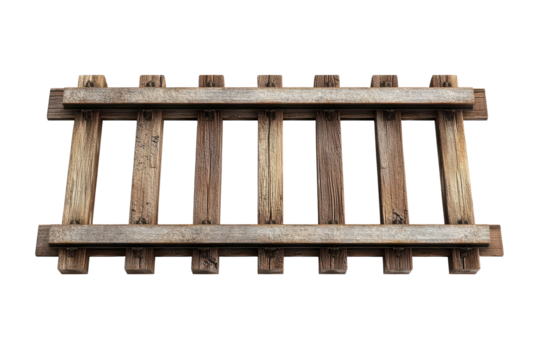 Detailed view of a set of railway rails laid out in a grid pattern showcasing the texture and color variations of wood against a clean white background