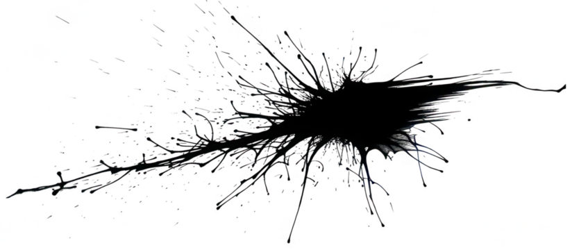 Explosive black ink splatter spreading aggressively across a wide horizontal surface with thin long streaking trails