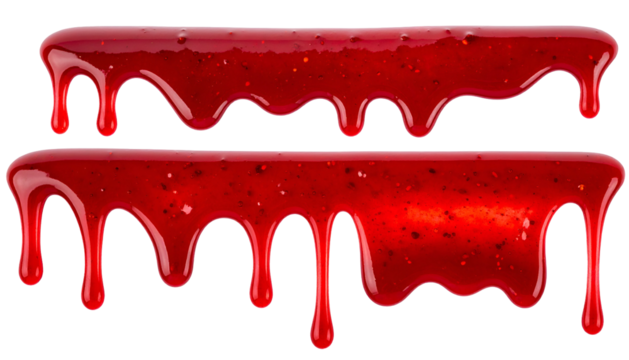 Two horizontal stripes of glossy red, viscous, dripping liquid against a black background