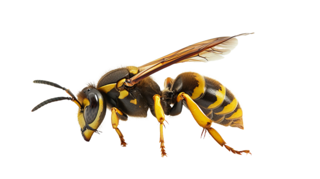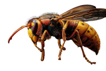 Close-up of a European hornet, showcasing its intricate details and vibrant colors against a transparent background. background removed