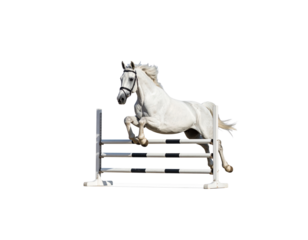 A majestic black horse with a flowing mane leaps gracefully against a stark white background. its strength and elegance. ideal for use in equine-themed projects or promotional materials
