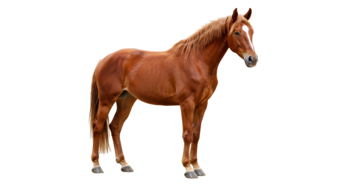 Bay horse with black mane and tail standing in profile pose, isolated on a transparent background