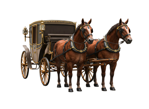Elegant gold and maroon horse drawn carriage isolated on transparent background