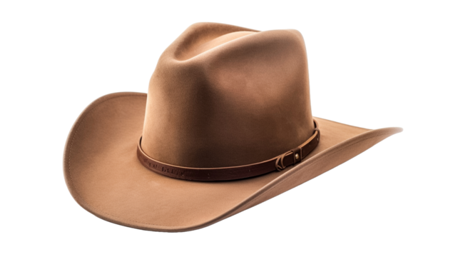 Rodeo horse rider; wild west culture; Americana and american country music concept theme with a brown leather cowboy hat isolated on white background with clip path cut out