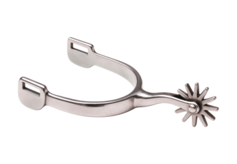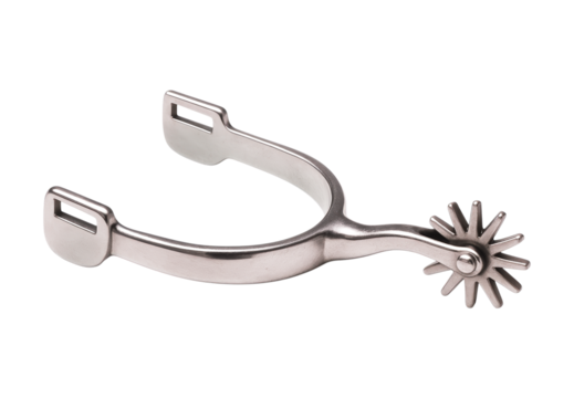 A single brushed stainless steel western cowboy riding spur with a ten-point rowel, an equestrian equipment tack, Isolated on Transparent and White Background