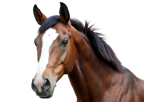 A majestic bay horse with a leather halter, head turned right. Its gleaming coat stands out against a clean transparent background. background removed