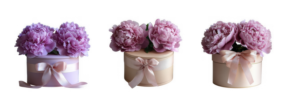 Three delicate floral arrangements in decorative boxes with ribbons isolated on transparent background