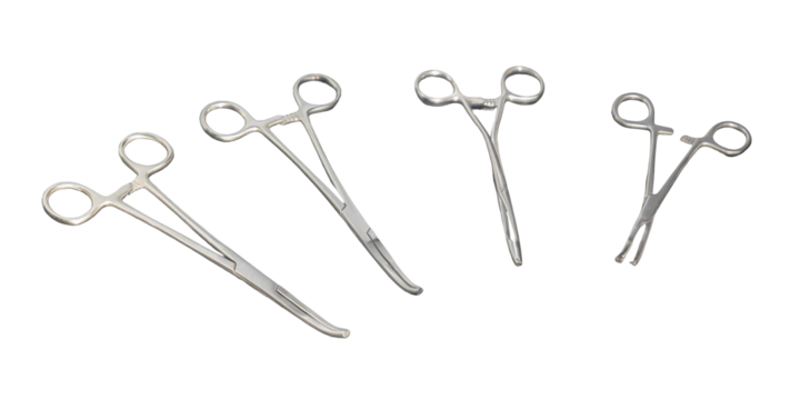 Four stainless steel surgical clamps and hemostats isolated on white background, medical instruments set of metal forceps for hospital surgery, healthcare equipment tools cut out, no people