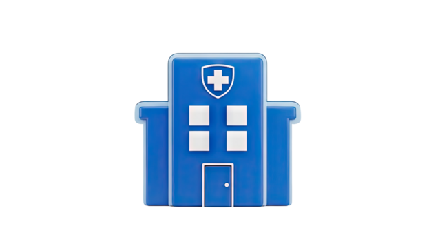 3D Blue hospital building icon with white cross and windows on transparent background