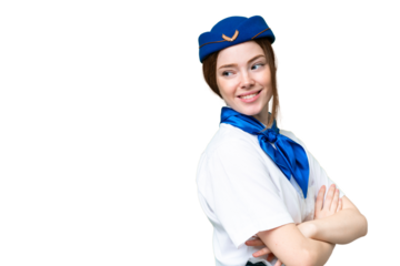 Airplane stewardess over isolated chroma key background with arms crossed and happy