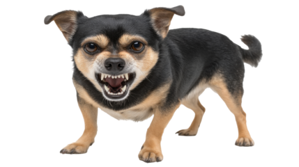 Angry small dog isolated on transparent background showing teeth in aggressive stance