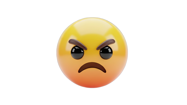 Furious Yellow Emoji Face Expressing Intense Anger and Frustration with Dark Eyebrows and Curved Mouth on Transparent Background