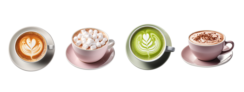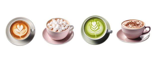 Collection of hot drinks such as matcha latte,coffee,hot chocolate and hot chocolate marshmallow isolated on transparent background. Generative Ai