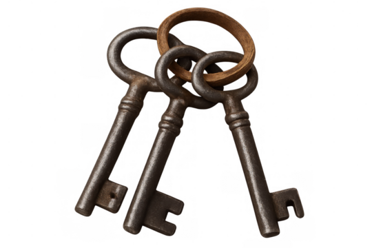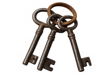 Antique metal keys bound by weathered leather strap, resting against translucent backdrop, embodying nostalgic historical essence of bygone era