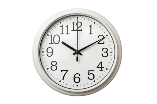 Round wall clock with visible hour and minute hands, isolated on white background.