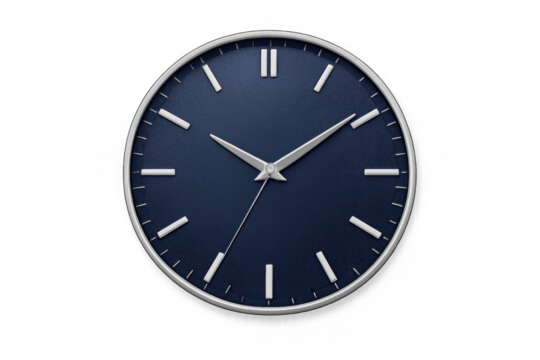 Modern analog wall clock with white face and black markers isolated on transparent background
