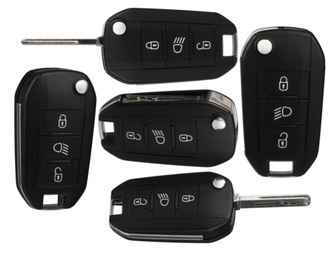 collection of five modern car key fobs with remote control buttons, presented from various angles against a transparent background for automotive services.