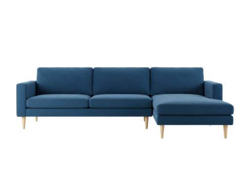 Modern navy blue sectional sofa isolated PNG, contemporary couch with chaise lounge on transparent background for interior design mockups