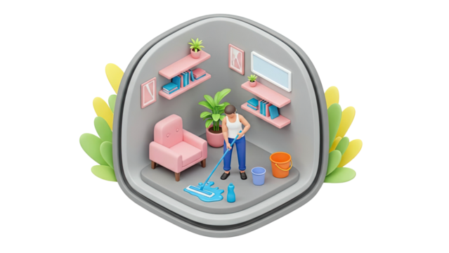 3D Isometric Illustration of a Person Mopping a Room
