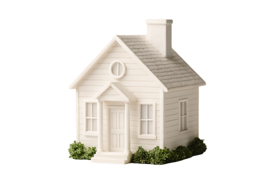 Minimalist white ceramic house figurine with classic gable roof and porch. Cute glossy white miniature house model with chimney and front door