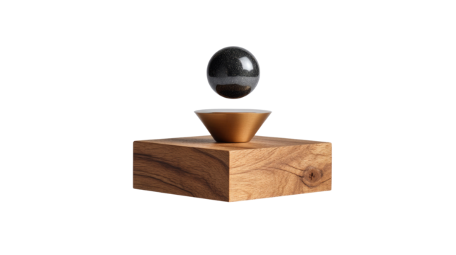Floating Sphere: A sleek, magnetic orb hovers effortlessly above a minimalist wooden base, creating a captivating display of levitation, perfect for technology, science, and innovation visuals.
