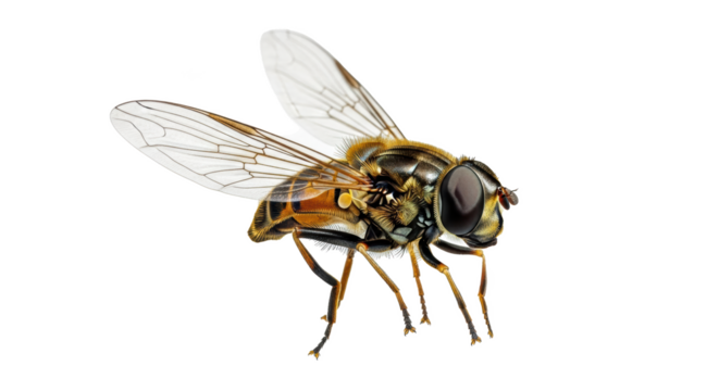 Bee-like hoverfly with veined wings and a striped abdomen, isolated on transparent background