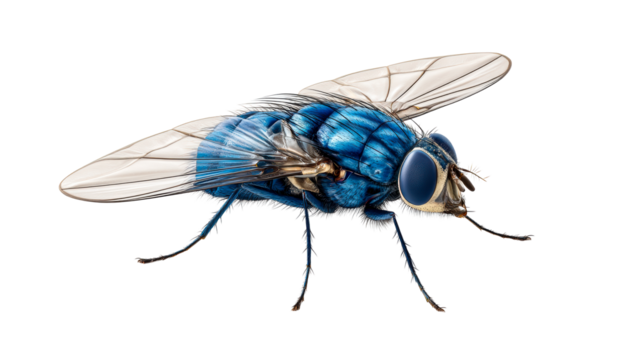 Extreme close-up of a metallic blue housefly with detailed wings and legs, cut out transparent