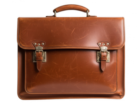 Vintage brown leather briefcase with metal buckles isolated on transparent background