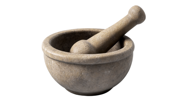A rustic mortar and pestle tools of ancient culinary arts for grinding herbs and spices on transparent background