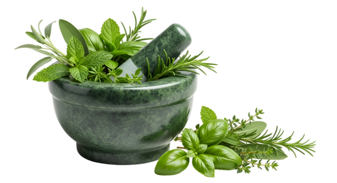 Fresh herbs in mortar ready for grinding isolated PNG with Transparent Background