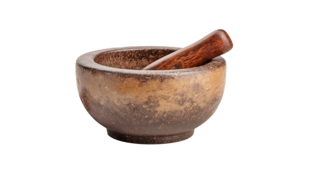 Traditional kitchen tool for grinding and mixing wooden mortar and pestle on isolated background.
