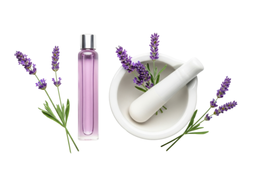 Isolated sprigs of lavender and essential oil bottle with mortar and pestle on the table