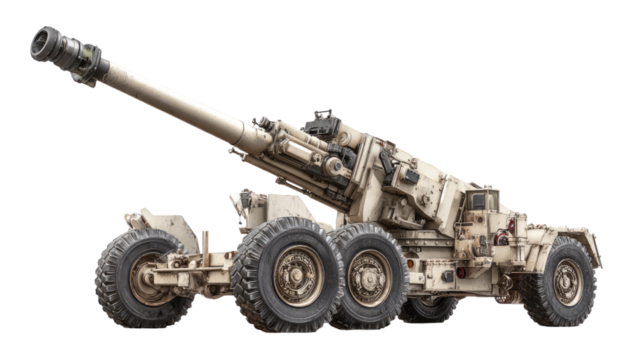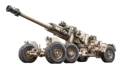 Mobile artillery piece howitzer stands ready military equipment armored weapon battlefield defense power isolated on white background
