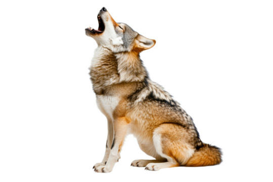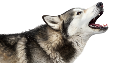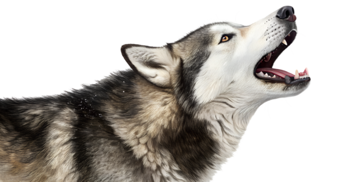 Close-up of a howling wolf, showcasing its fur and expression against a solid background.