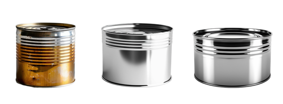 Rusting to Shine, three tin cans, left one rusty, middle polished, right chrome, showcasing material transformation. Isolated on white background