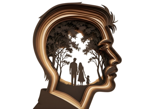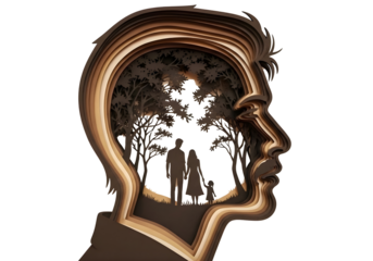 Silhouette of family in tree lined landscape inside human head profile isolated on transparent background