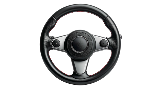 Overhead studio shot showcasing a realistic car steering wheel, black leather, red stitching, silver accents, and control buttons against a dark backdrop