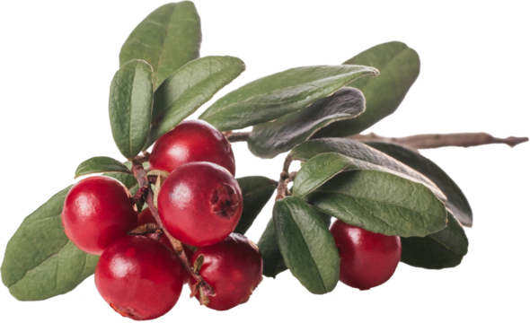 Close-up of twig of lingonberry cowberry bearberry red bilberry whortleberry foxberry huckleberry fruits of Vaccinium vitis-idaea with ripe red berries, green leaves on white background. Isolated.