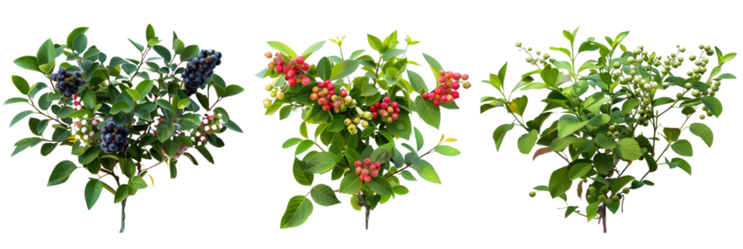 set of huckleberry bushes, fruit-laden, isolated on transparent background