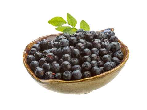 Pile of ripe huckleberries with fresh green leaves against a white background or Transparent PNG