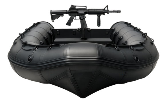 Sturdy inflatable boat with a reinforced hull and equipped with a firearm.
