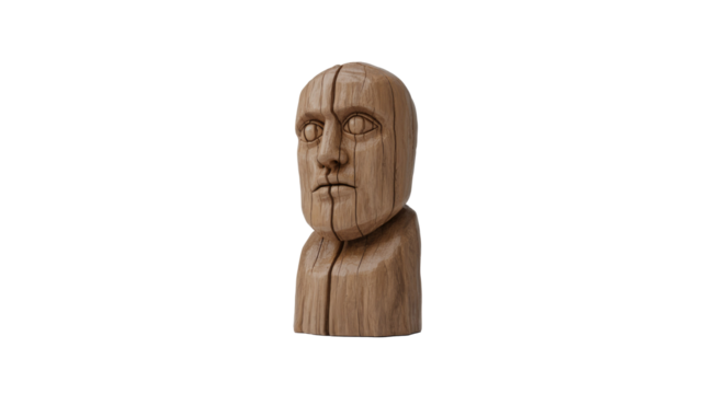 A raw wooden sculpture of a stylized human head, featuring visible grain and vertical cracks, depicted on a plain transparent background. background removed
